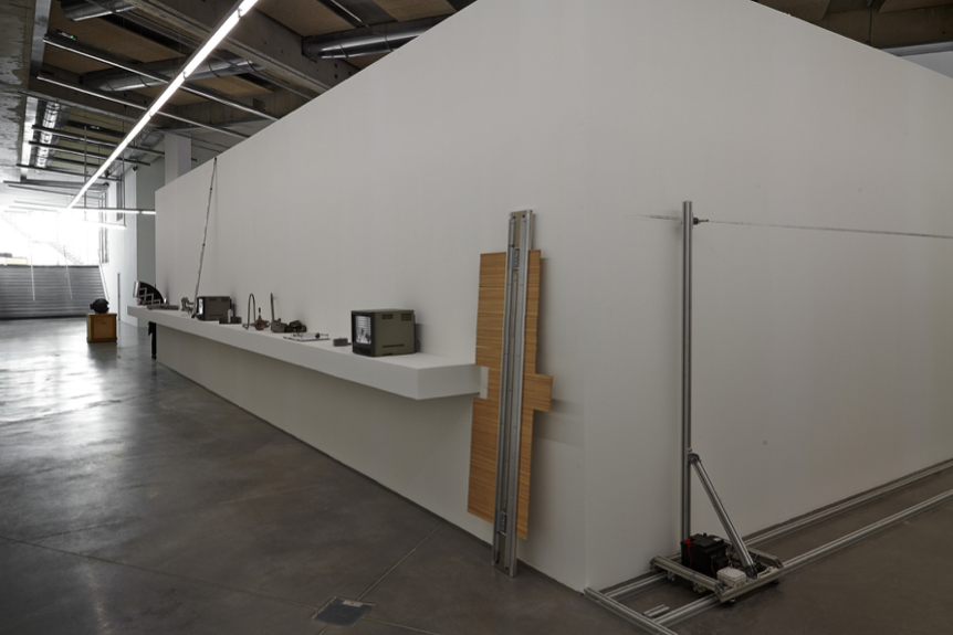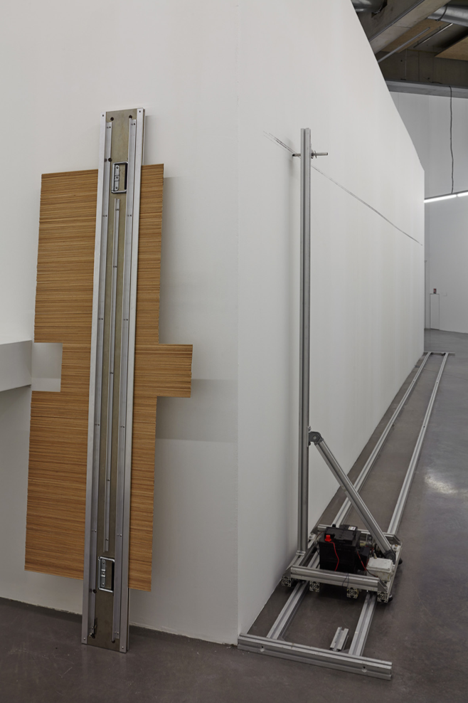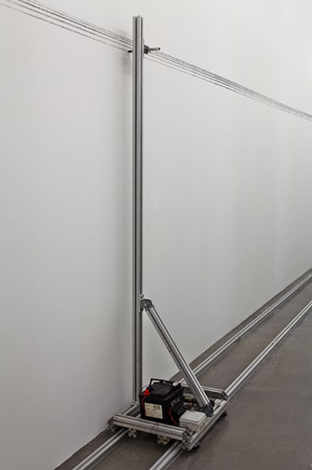 La machine travelling Avancer-reculer-tracer se déplace sur un rail pour réaliser l’étude de fréquentation d’un territoire spécifique à l’art, l’espace d’exposition : un marquage au crayon graphite garde en mémoire la circulation des visiteurs dans l’espace. À chaque passage, la machine trace une ligne aller-retour qui devient de plus en plus noire à mesure que le nombre des visiteurs augmente. Un capteur placé dans l’espace accumule le nombre de passages par jour, au total 100 lignes horizontales pour les 100 jours de l’exposition. Chaque jour, le curseur descend de 1,83 centimètres. Les lignes accumulées dessinent ainsi une partition graduée de l’exposition, orchestrée par le spectateur.