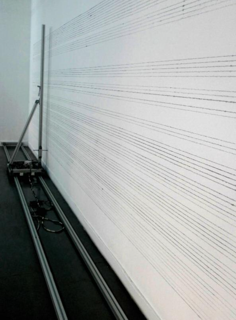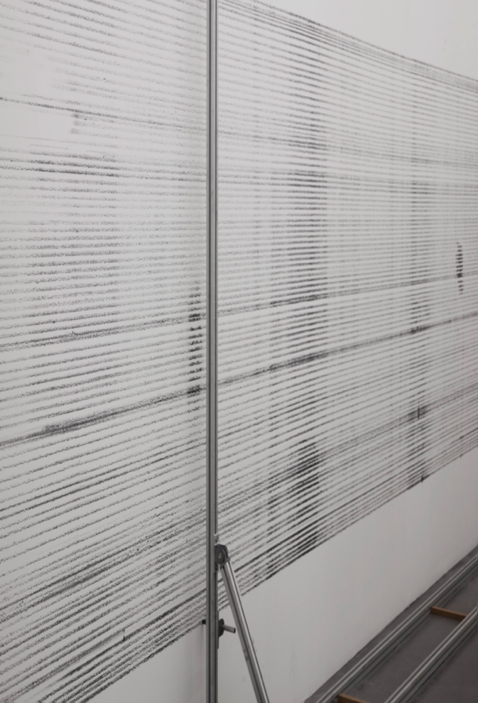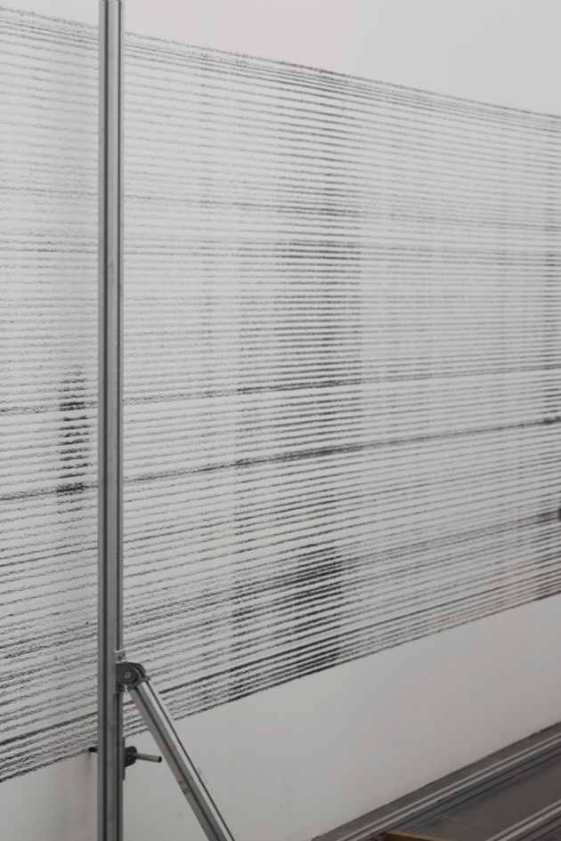 « Ce qui m’intéresse c’est de créer, à partir d’une combinaison aléatoire, le développement d’un graphique qui révèle une grille de lecture du passage et de la durée de l’exposition. J’aime l’idée que la mine graphite s’altère et change d’épaisseur au fur et à mesure du frottement sur le mur. On est dans un processus « machinique » qui développe un dessin imparfait. Un semblant d’étude de fréquentation qui n’en serait pas un... » (Marie Reinert).